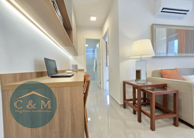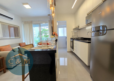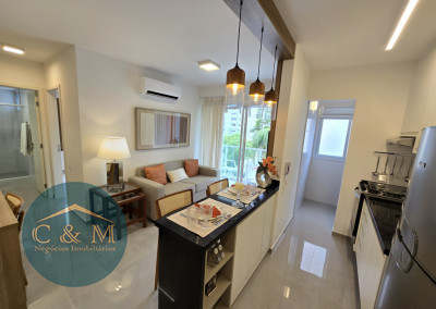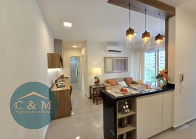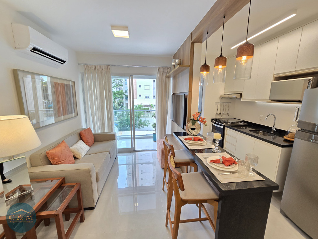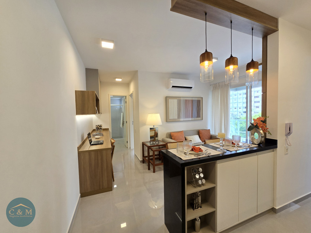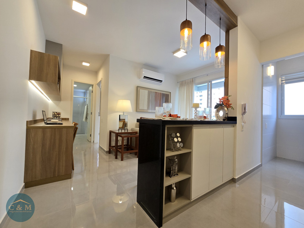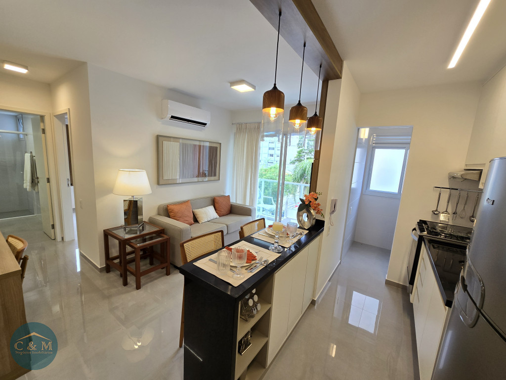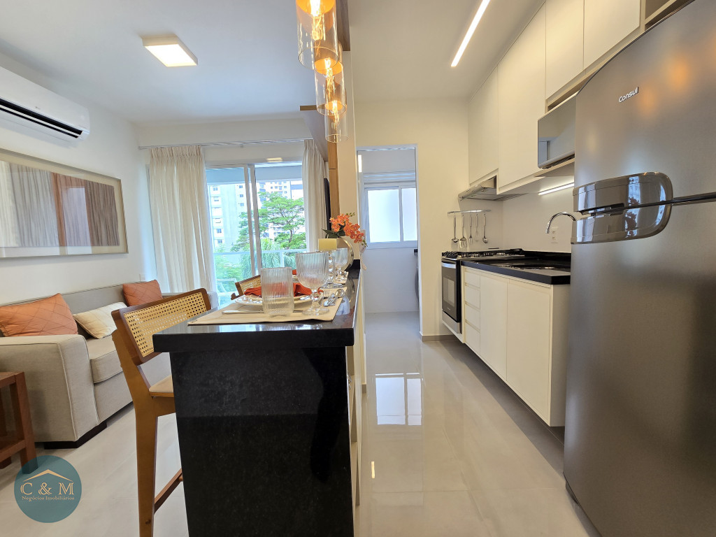 Apartamento de 45m² distribuído em 1 dormitório, 1 banheiro social, sala com varanda, cozinha americana com bancada em granito, área de serviço e área técnica para condensadora, 1 vaga de garagem (podendo optar por 2 vagas). Prédio novo.