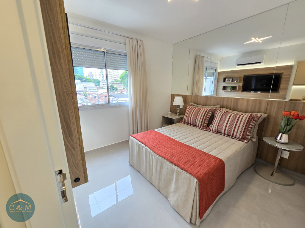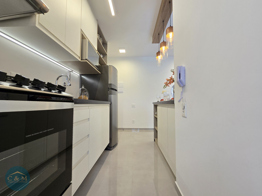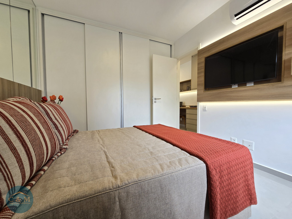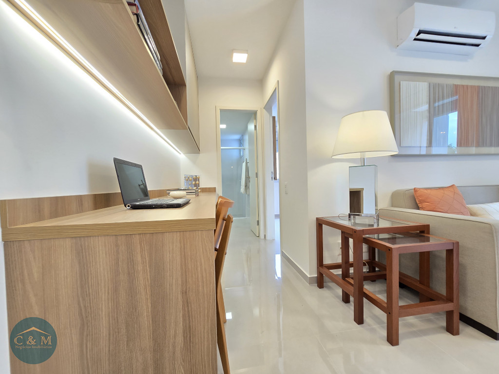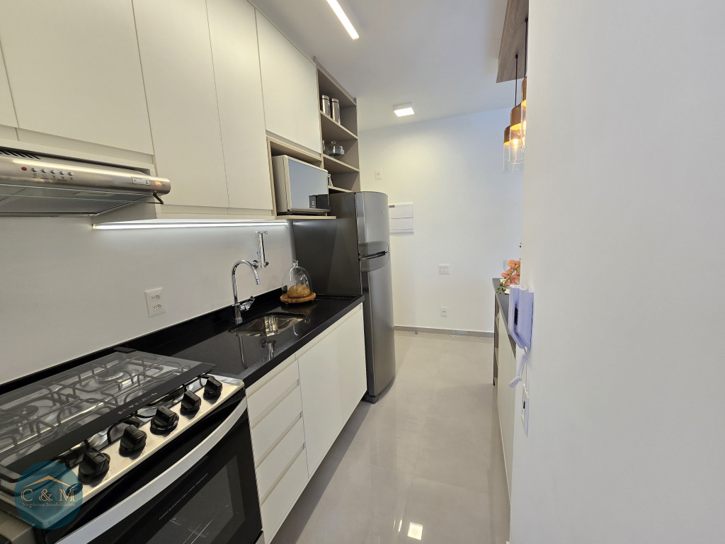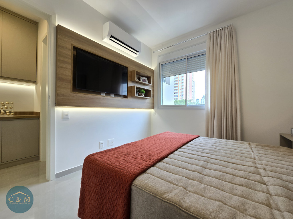 Apartamento de 45m² distribuído em 1 dormitório, 1 banheiro social, sala com varanda, cozinha americana com bancada em granito, área de serviço e área técnica para condensadora, 1 vaga de garagem (podendo optar por 2 vagas). Prédio novo.