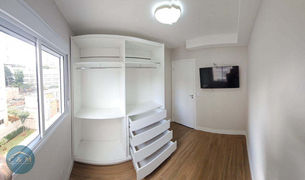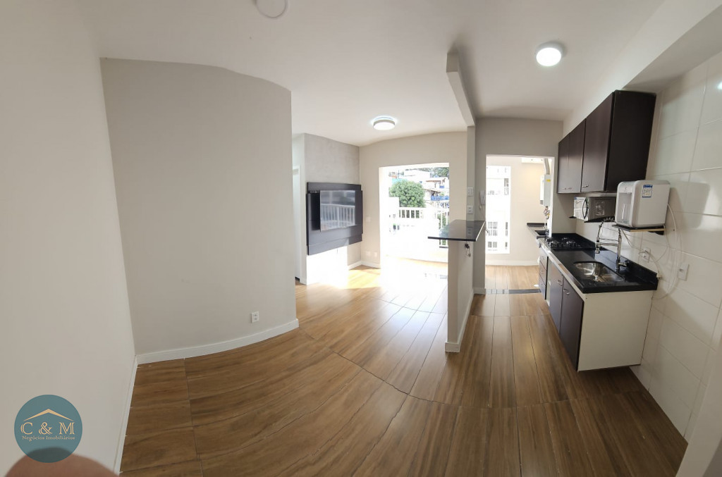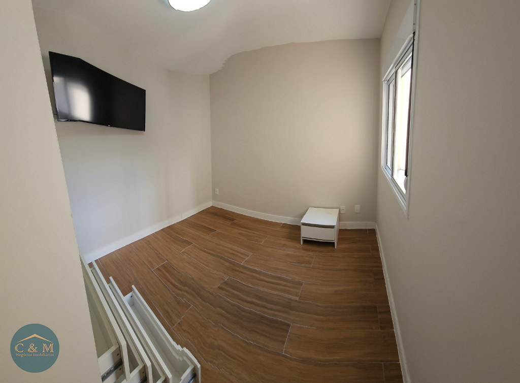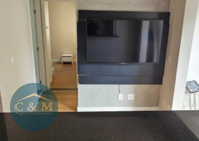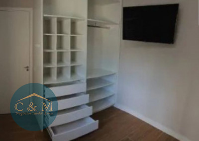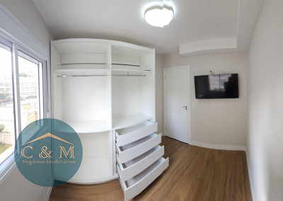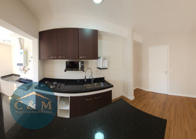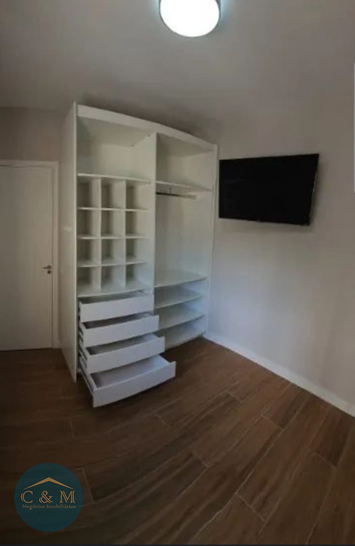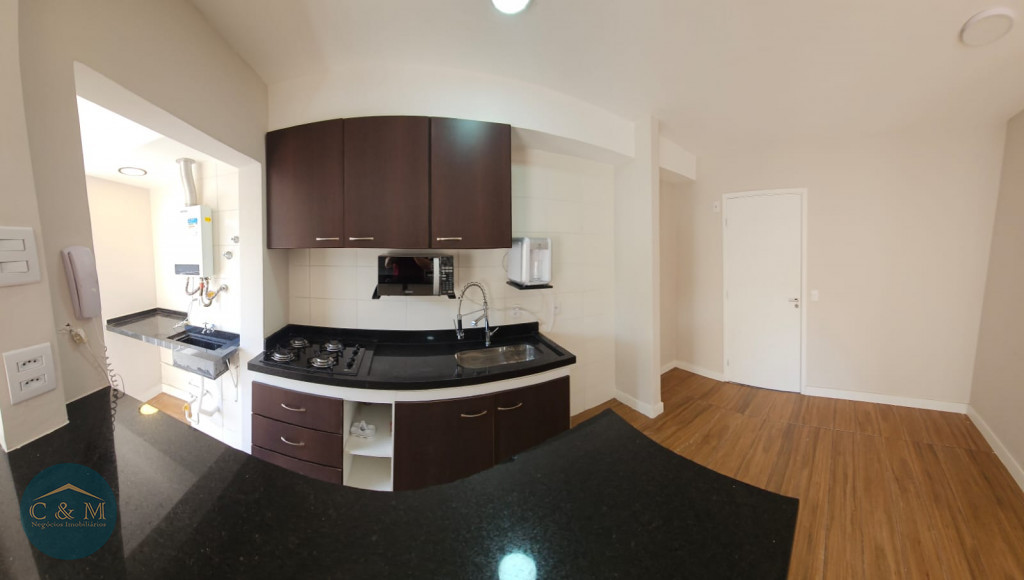 Repleto de armários planejados, fogão embutido, televisão com painel instalado, aquecedor a gás do chuveiro, acabamento de alto padrão, piso em porcelanato tipo madeira.
