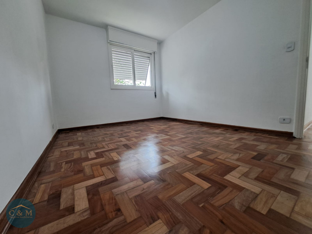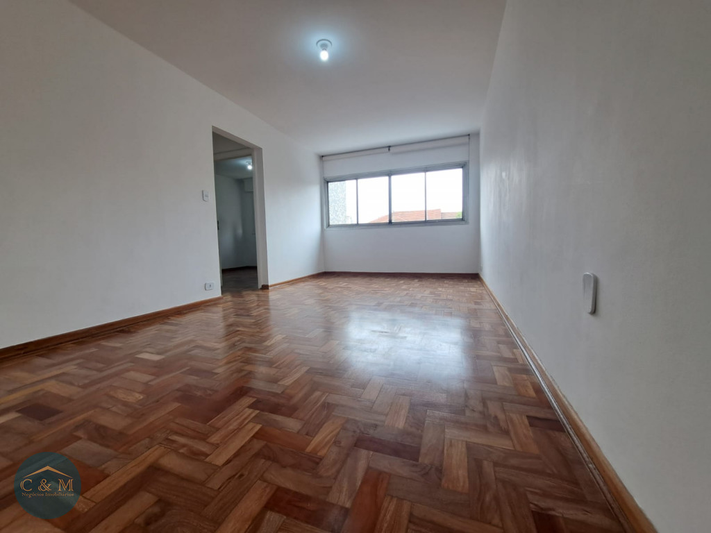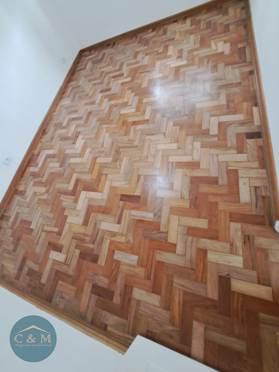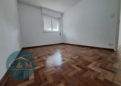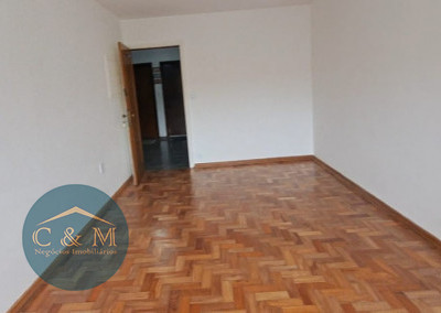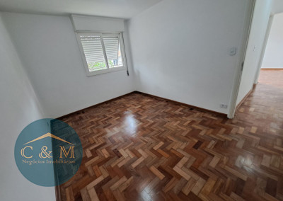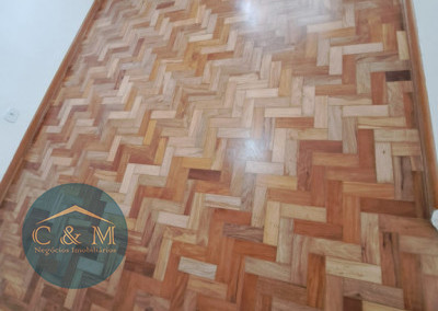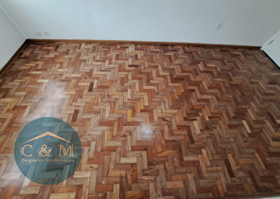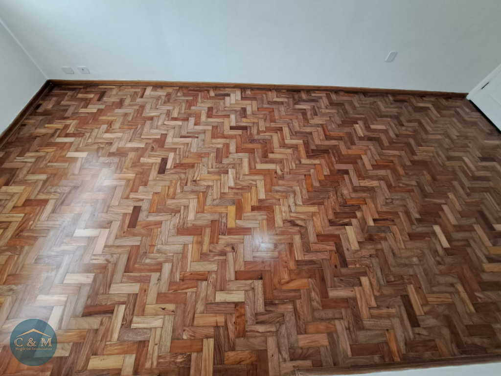 A sala espaçosa com cerca de 15 m², é um dos grandes destaques: possui piso em taco de madeira em ótimo estado de conservação, com brilho e elegância que valorizam o ambiente. A ampla janela garante excelente iluminação natural e ventilação, tornando o espaço ideal para dois ambientes confortáveis.