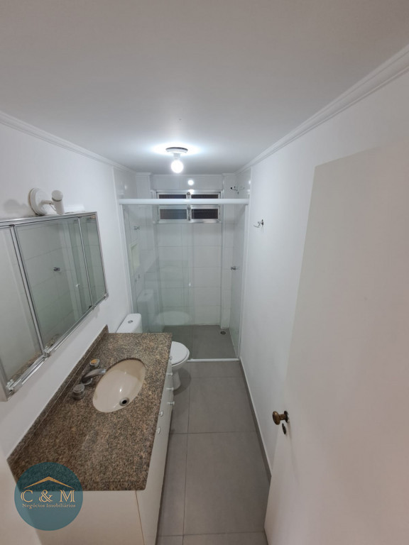 O banheiro principal é moderno, com box, gabinete e acabamento de bom gosto.