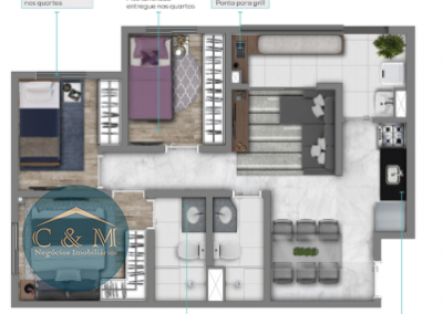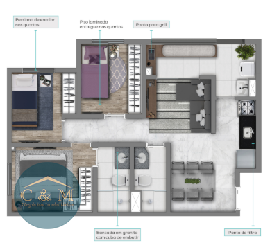 Apartamento Novo 55m² à venda distribuídos em 3 dormitórios sendo 1 suíte, sala 2 ambientes com varanda e vista livre, cozinha/área de serviço. Conta com 2 vagas de garagem (1 fixa e 1 sorteio) cobertas. Sala/cozinha no contrapiso e dormitórios com piso laminado, persianas de enrolar, ponto grill na varanda, ponto de filtro na cozinha, infraestrutura para instalação de ar condicionado, gás encanado