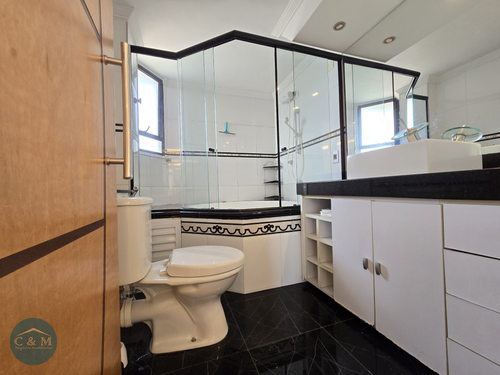 Parte de cima uma suíte espaçosa com janela ampla, vista livre, armário planejado, ar condicionado e banheira de hidromassagem.