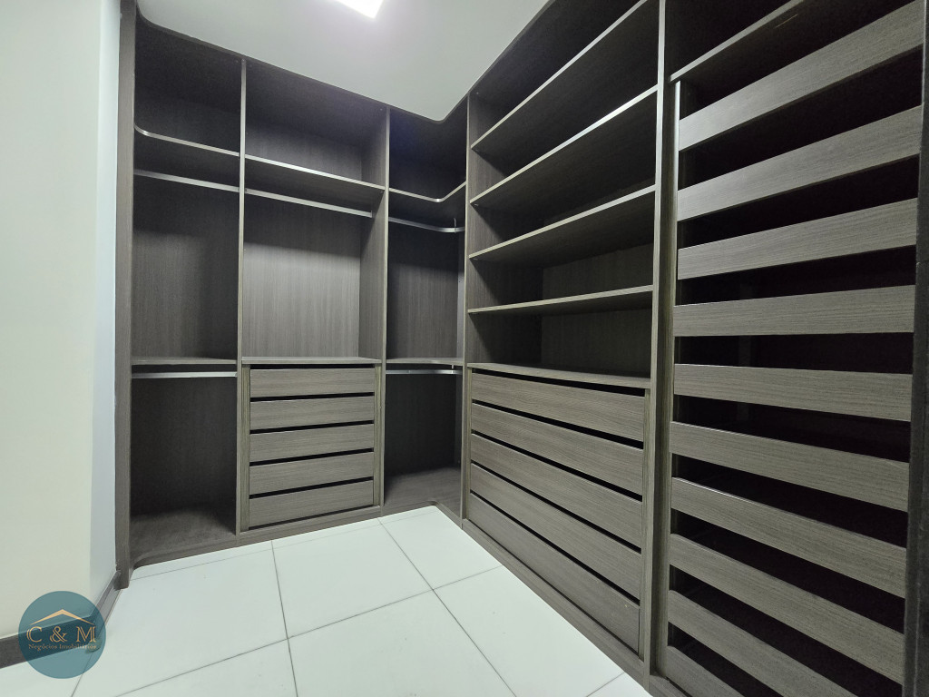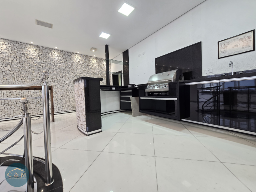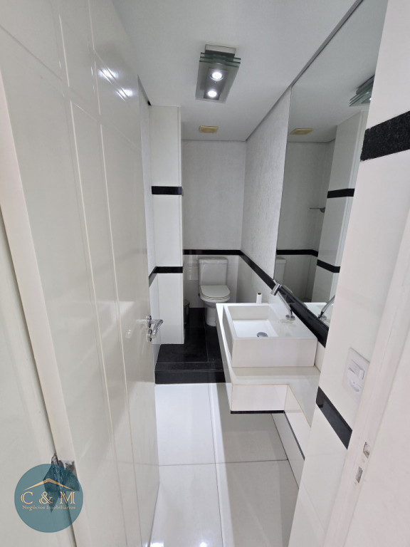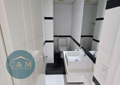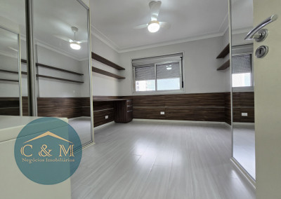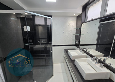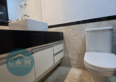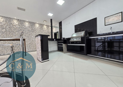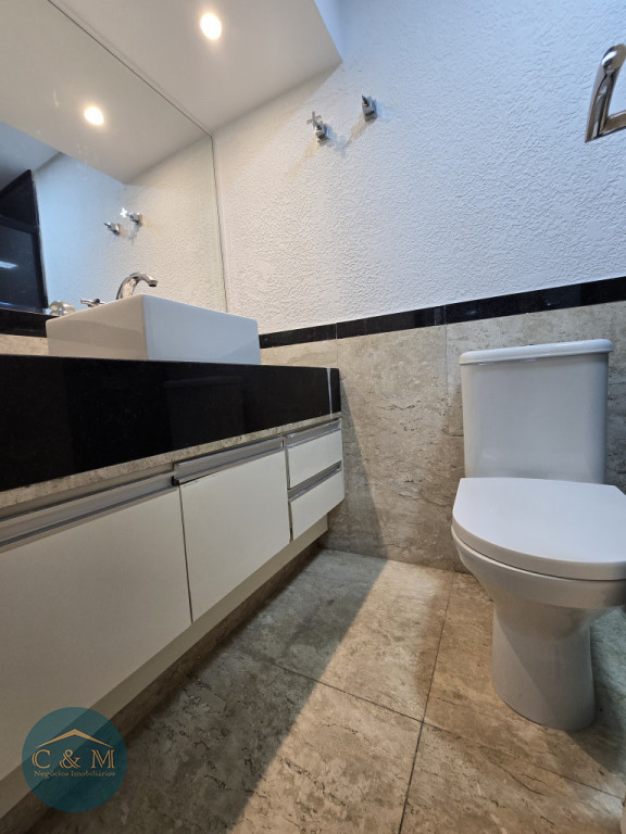 Piso inferior: Sala ampla em 2 ambientes com janela do chão ao teto trazendo luminosidade para o ambiente e vista linda, lavabo, 3 dormitórios sendo 2 suítes, uma master (closet, banheiro com pia dupla), 1 banheiro social no corredor que atende o outro dormitório, cozinha. Todos os ambientes amplos e arejados, persianas de enrolar, repleto de armários planejados, detalhes de luz, box em vidro, ar condicionado. Entrada social e de serviço.