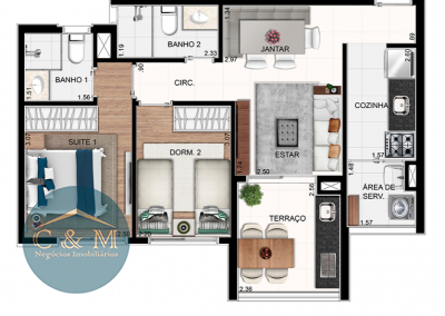 Apartamento novo de 56m² à venda distribuídos em 2 dormitórios sendo 1 suíte, sala 2 ambientes, varanda gourmet envidraçada, cozinha, área de serviço. Armário na cozinha, banheiros, suíte e área gourmet. Ar condicionado na sala, infra para ar nos outros cômodos. Possui 1 vaga de garagem rotativa.